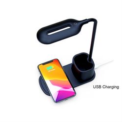 Illuminate your workspace in style with our sleek and innovative LED desk lamp. Featuring a built-in Qi wireless charging pad, you can keep your phone powered up while you work. Enjoy flicker-free, eye-care lighting with adjustable brightness levels perfect for reading, studying, or video calls. Say goodbye to messy cables with the reliable wireless charger. Plus, with convenient extras like a pen holder and USB charging port, this lamp is the perfect desktop companion for students, remote workers, and home office setups. Stay organized and productive with this all-in-one solution.